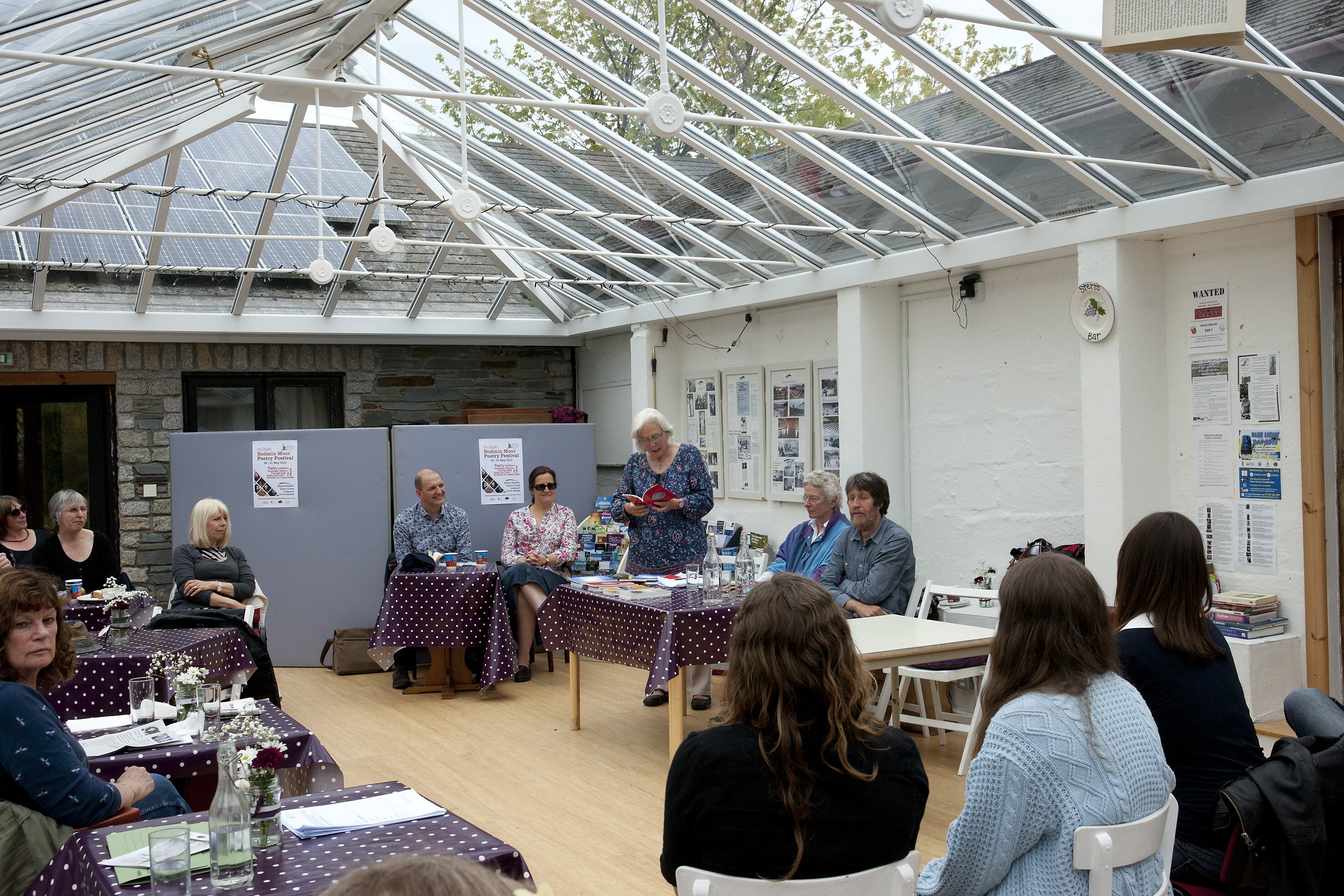 Sterts Theatre at Upton Cross is not a venue you come by casually - a covered amphitheatre just below Wheal Tor, function rooms and a communal dining room, with a kitchen serving home-cooked food through the day, and a bar beer and wine long into the evening - but once there, there is no need to go far. Staged from Friday to Sunday evening, the full programme and discounted day and full festival tickets now attract many who want to stay the distance, find accommodation locally and immerse themselves in poetry, be in the company of poets the whole weekend. Already known for the friendliness of its audience and their hosts, poets Ann Gray and David Woolley, several of the readers stay on too, supporting old friends or making new ones.