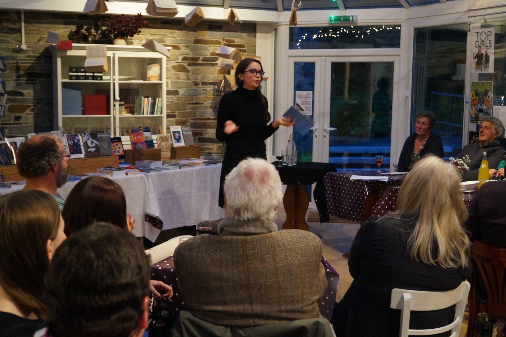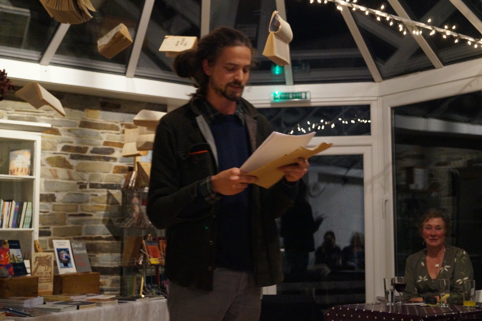 A literature festival should speak of its place and to its people and give opportunities to those writers and would-be writers who call its locale home. Each academic year, the organisers run a Young Poets Mentoring Scheme, providing tuition and support culminating in internships at the event. For the second year, Rachael Allen from nearby Dobwalls and now published as the ninth in Faber’s New Poets series of pamphlets hosted a late night poetry cabaret in the company of the quietly demanding presence of Sophie Collins and Kit Buchan who is the best trumpeting poet since Ted Joans and a film critic in the line of Pauline Kael as adept at making movies of words as he is taking words to the movies. Meanwhile, former Liskeard resident and now Forward-shortlisted Karen McCarthy Woolf read her poems of child loss from ‘An Aviary of Small Birds’ (Carcanet, 2014) with the American poet Carrie Etter, who when a teenager in Normal, Illinois gave up her son to adoption and has since written him birthday poems collected in ‘Imagined Sons’ (Seren, 2014) in a devastating pairing.